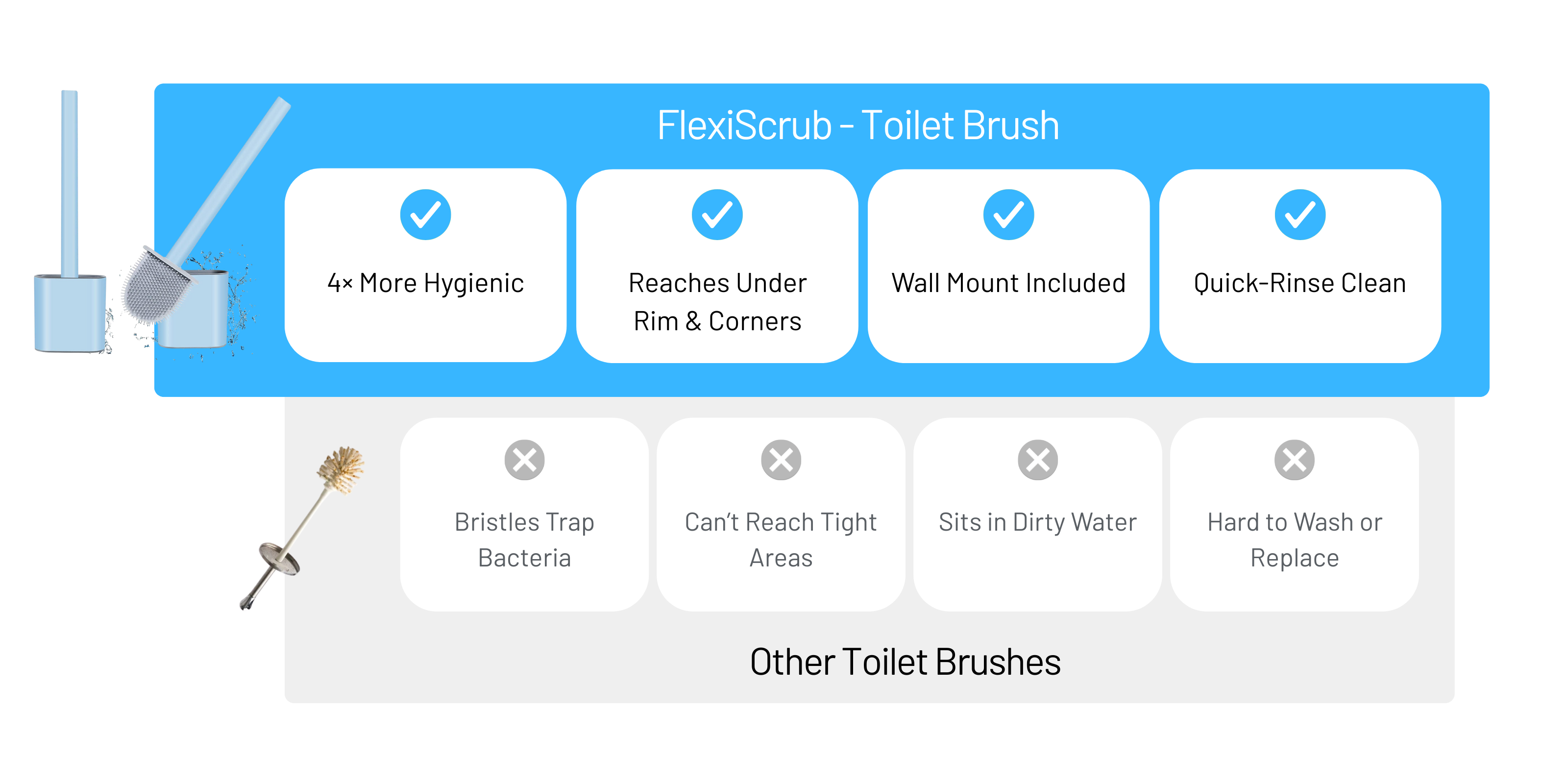 Traditional toilet brushes trap germs and look awful. FlexiScrubβ’ is designed with non-porous silicone bristles that resist bacteria, reach every angle, and stop germs from lingering in your bathroom.
